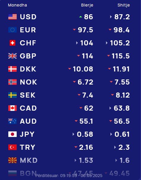 Euro ka vijuar edhe këtë të martë, 6 maj, prirjen rënëse në tregun valutor vendas, duke shënuar një tjetër zbritje të lehtë përballë lekut shqiptar. Sipas kursit zyrtar të këmbimit, euro blihet me 97.5 lekë dhe shitet me 98.4 lekë, duke reflektuar dobësinë e saj në tregjet e brendshme për të disatën ditë me radhë.
