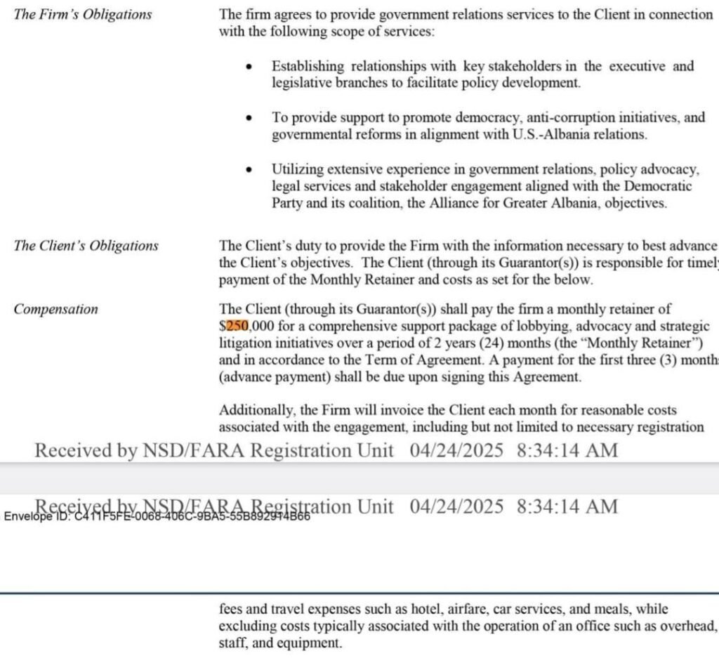 Në dokumentin e kontratës thuhet se pagesa për tre muajt e parë duhet të bëhet menjëherë pas nënshkrimit. Firma do të angazhohet në krijimin e marrëdhënieve me vendimmarrës në degët ekzekutive dhe legjislative të SHBA-së, me qëllim forcimin e mbështetjes për politikat e PD-së dhe promovimin e reformave qeveritare dhe nismave kundër korrupsionit në përputhje me marrëdhëniet Shqipëri-SHBA.