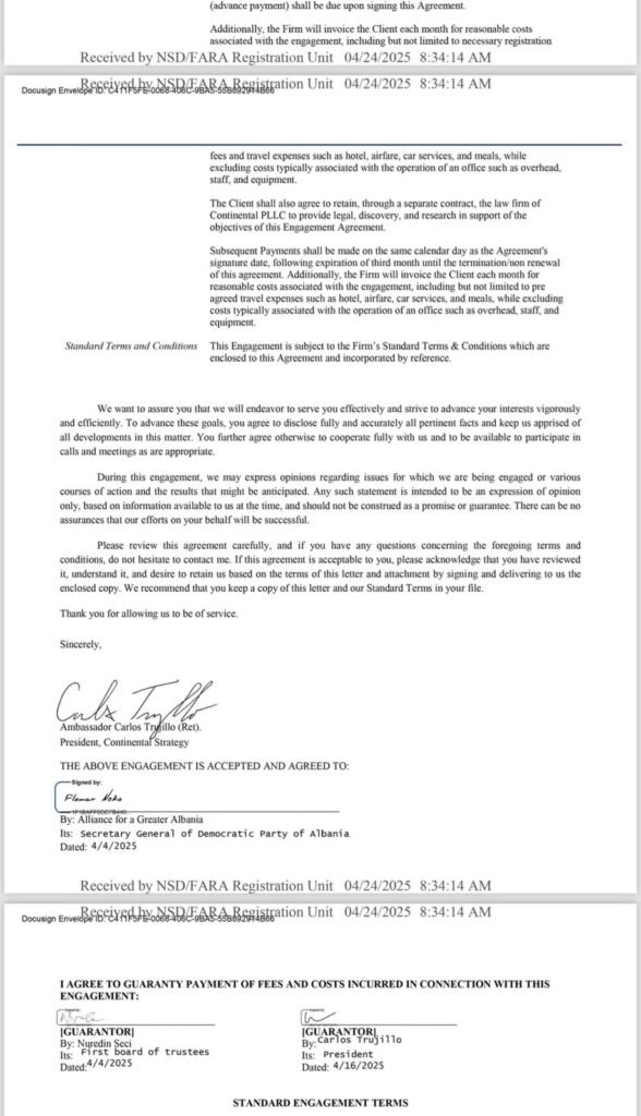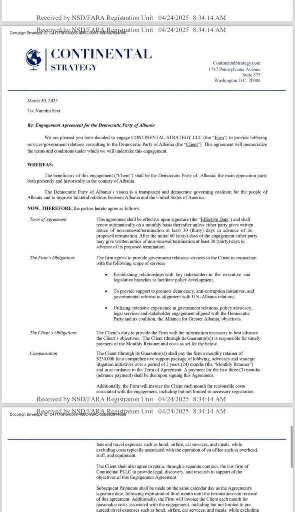 Marrëveshja është firmosur më 4 prill nga sekretari i përgjithshëm i PD-së, Flamur Noka, dhe ka si garant në Shtetet e Bashkuara shtetasin Nuredin Seçi. Kontrata me firmën “Continental Strategy” parashikon një angazhim dyvjeçar, me pagesë mujore prej 250,000 dollarësh për shërbime dhe strategji politike.